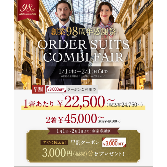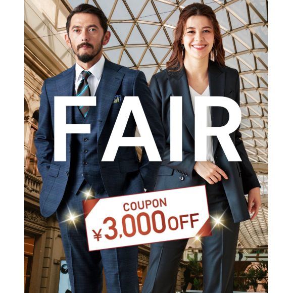 ราคาเริ่มต้นประมาณ 20,000 เยนต่อชิ้น! รับส่วนลด 3,000 เยน เมื่อซื้อสูทสั่งตัดสองชุด